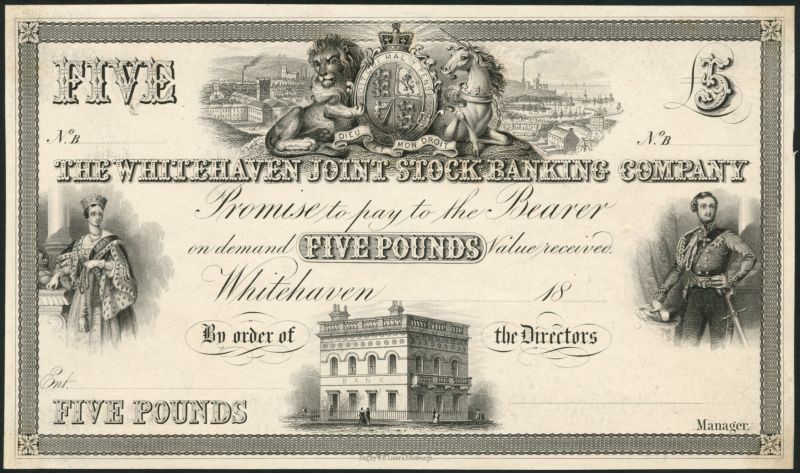 Whitehaven Joint Stock Banking Company, proof £5 on thin card, 18- (1829-1888), black and white, Royal arms top centre, Queen Victoria at left, Prince Albert at right, bank building low centre