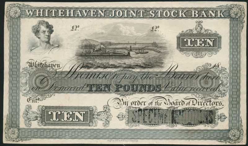 Whitehaven Joint Stock Bank, an obverse proof £10 on card, 18- (1829-1888), blue-grey and white, view of Whitehaven top left, head of George IV top left, value in tablet top right and low left, ornate engine turnings in field