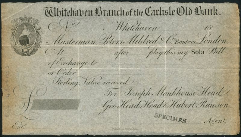 Whitehaven Branch of the Carlisle Old Bank (Head,Head & Rawson), an unissued sight bill, 18-, also two issued sight bills (Head and Head), dated 1851 and 1853, all black and white, crowned vignette of a maiden at top left
