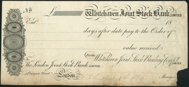 Cumberland Union Banking Company Limited, Whitehaven, proof Post bills (3), 186-, one payable in gold, Head,Head & Rawson proof Post bills (3), also Whitehaven Joint Stock Bank proof sight bills (3), proof cheques (3)