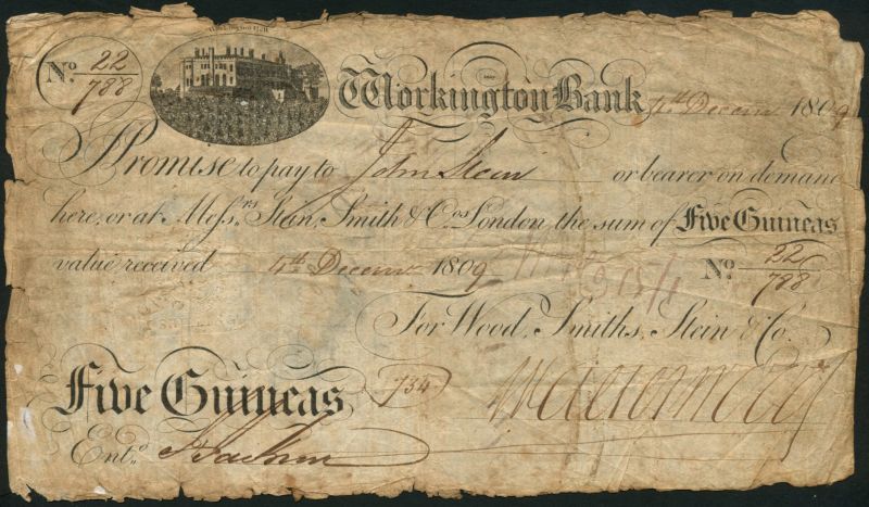 Workington Bank (Wood,Smiths,Stein & Co.), 5 guineas, 4 December 1809, serial number 22/788, black and white, Workington Hall in oval frame top centre, two manuscript signatures below