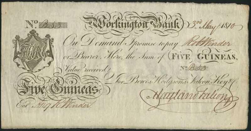 Workington Bank (Bowes,Hodgsons,Falcon,Key & Co.), 5 guineas, 3 May 1810, serial number B53, black and white, arms at left, manuscript signature of Falcon low right