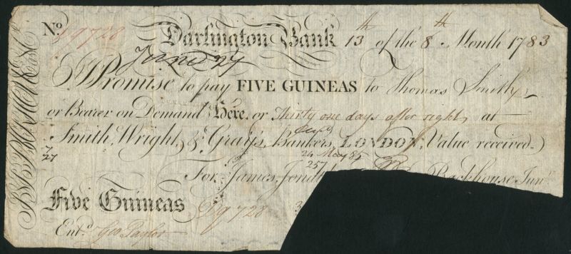 Darlington Bank (James, Jonathan and James Backhouse Junr.), 5 guineas, 13 August 1783, serial number F 9728, black and white