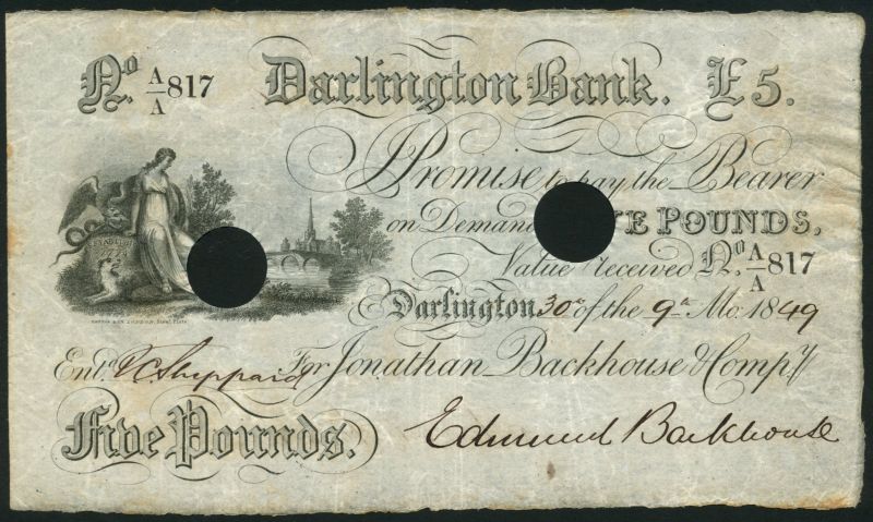 Darlington Bank (Jonathan Backhouse & Compy.), £5, 30 September 1849, serial number A/A 817, black and white, allegorical maiden, dog, serpent and eagle and a view of Darlington at left, manuscript signature of Edmund Backhouse low right, reverse blue grey central panel