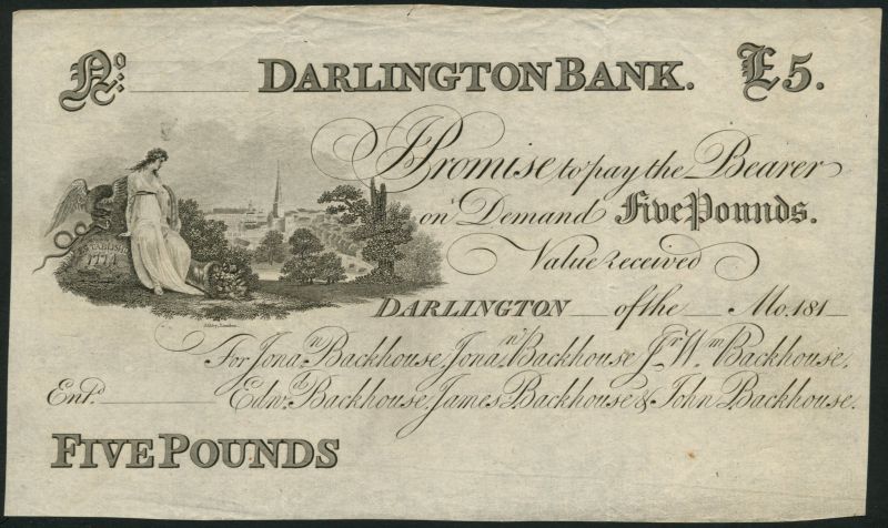 Darlington Bank (Jonathan Backhouse,Jonathan Backnouse,J.W.Backhouse,Edw. Backhouse,James Backhouse & John Backhouse) & Compy.), proof £5, 181-, no serial numbers black and white, allegorical maiden, dog, serpent and eagle and a view of Darlington at left, manuscript signature of Wm. Backhouse low right