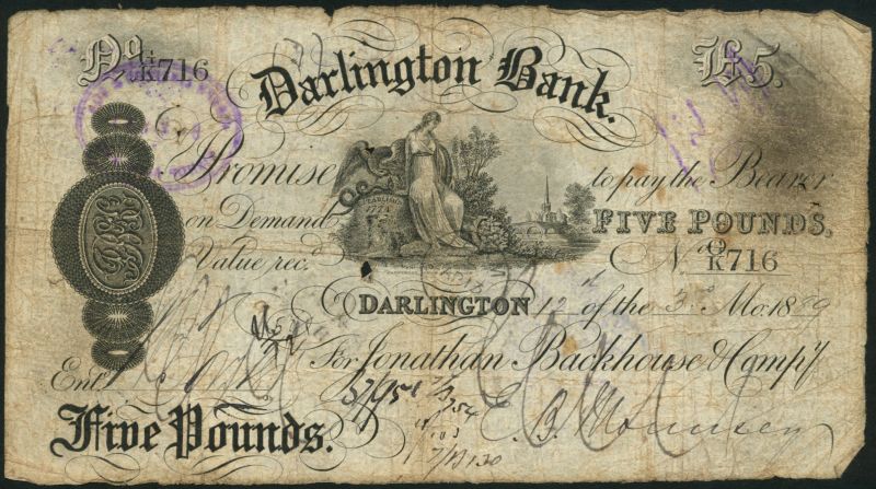 Darlington Bank (Jonathan Backhouse & Compy.), £5, 4 March 1889, serial number G/K 716, black and white, allegorical maiden, dog, serpent and eagle and a view of Darlington at left, manuscript signature of E.B Morrissey low right, reverse grey central panel