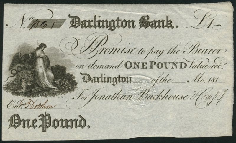 Darlington Bank (Jonathan Backhouse & Compy.), proof £1 and unissued £1, 181-, black and white, allegorical maiden, dog, serpent and eagle