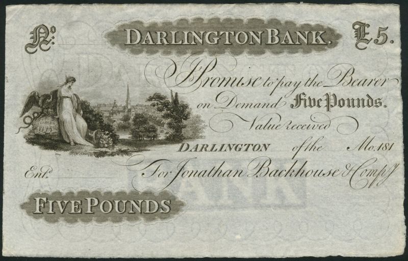 Darlington Bank (Jonathan Backhouse & Compy.), proof £5 and unissued £5, 181-, black and white, allegorical maiden, dog, serpent and eagle and a view of Darlington at left