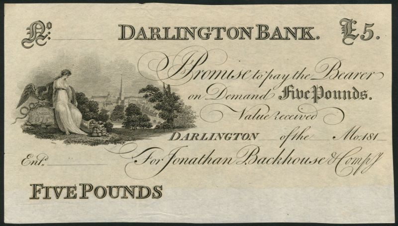Darlington Bank (Jonathan Backhouse & Compy.), proof £5 on card and unissued £5, 181-, black and white, allegorical maiden, dog, serpent and eagle and a view of Darlington at left