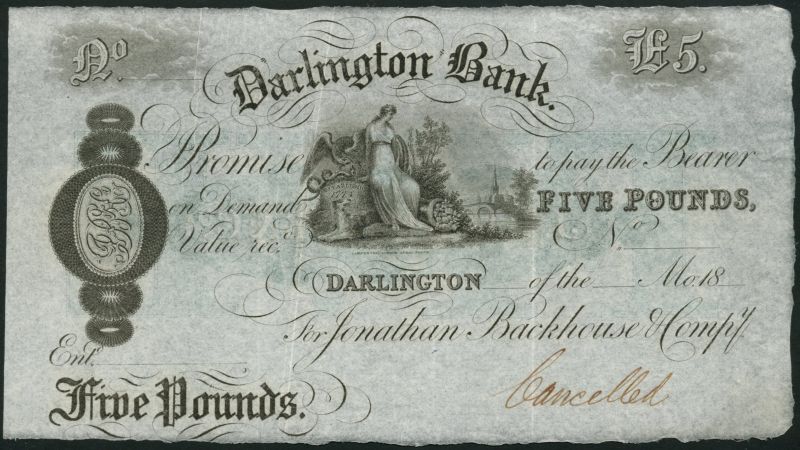 Darlington Bank (Jonathan Backhouse & Compy.), unissued £5 (2), 181-, black and white, allegorical maiden, dog, serpent and eagle and a view of Darlington at centre, partners initials in oval frame at left, reverse grey central panel