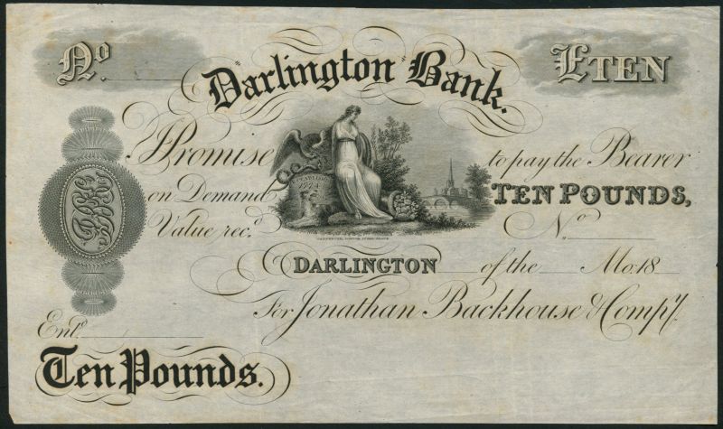 Darlington Bank (Jonathan Backhouse & Compy.), proof £10, 18-, black and white, allegorical maiden, dog, serpent and eagle and a view of Darlington at centre, partners initials at left in oval frame at left