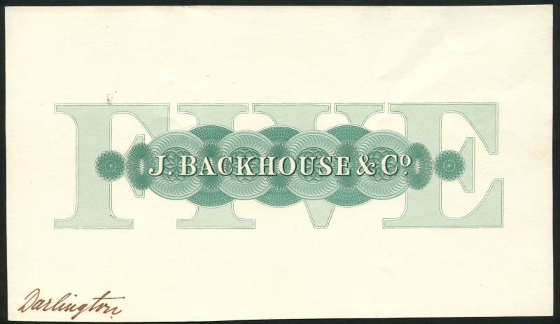 Darlington Bank (Jonathan Backhouse & Compy.), reverse proof £5 on card, one black and white, one green and white, value and partnership name at centre