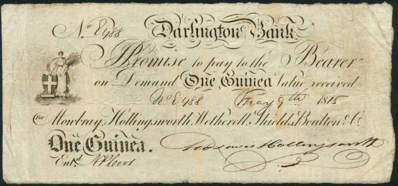 Darlington Bank (Mowbray, Hollingsworth, Wetherall, Shields,Boulton & Co.), 1 guinea, 9 May 1815, serial number E488, black and white, maiden with arms and corn sheaf at left, manuscript signature of Hollingsworth low right