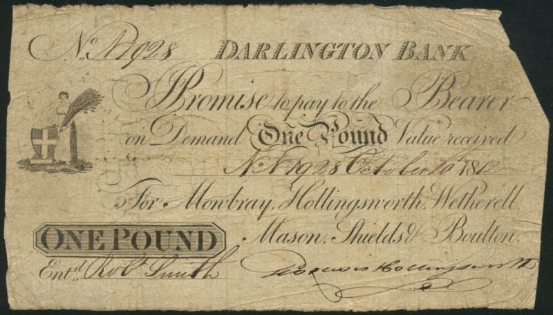 Darlington Bank (Mowbray, Hollingsworth, Wetherall, Mason,Shields and Boulton), 1 pound, 28 October 1812, serial number 1928, black and white, maiden with arms and corn sheaf at left, manuscript signature of Hollingsworth low right