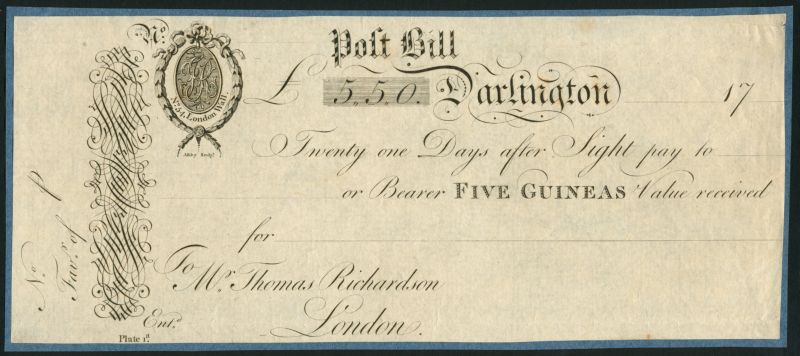Darlington post bill, unisued 5 guineas, 17-, partners initials in shield top left (Outing 630 for bank), mounted on thin card, good very fine, rare