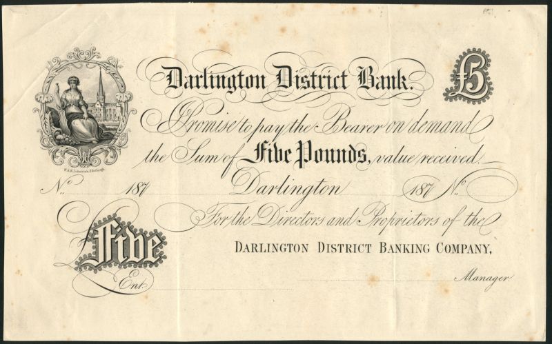 Darlington District Bank, proof £5 on card, 187-, black and white, maiden with rudder, view of Darlington top left, value top right