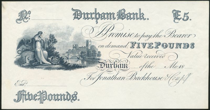 Durham Bank (Jonathan Backhouse and Compy.), obverse and reverse proof on card for £5 (2), 18-, black and white, allegorical maiden with dog, serpent and eagle and cornucopia top left, view of Darlington in background, reverse red central panel