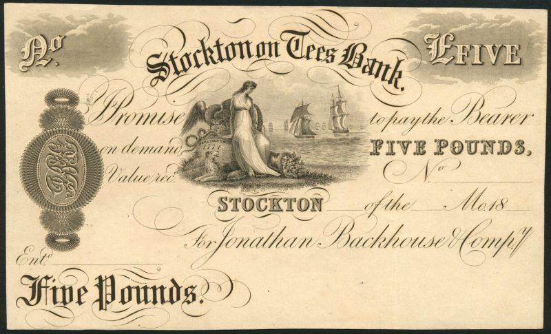 Stockton on Tees Bank (Jonathan Backhouse & Compy.), obverse and reverse proof on card for a £5, 18-, black and white, maiden, dog, serpent and eagle, ships in background, at centre, reverse mauve central panel, also a reverse on paper with blue central panel and ink annotation with reference to Barclay & Fry