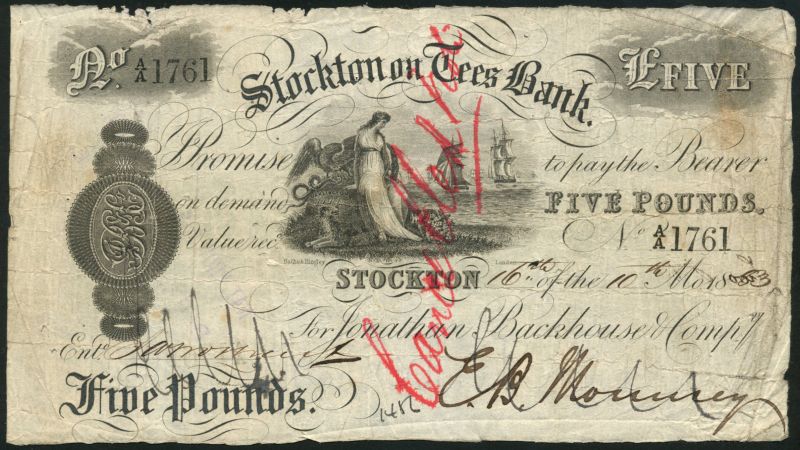 Stockton on Tees Bank (Jonathan Backhouse & Compy.), £5, 16 October 1883, serial number A/A 1761, black and white, maiden, dog, serpent and eagle, ships in background, at centre, manuscript signature low right, reverse green central panel