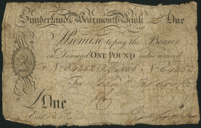 Sunderland and Wearmouth Bank (John & Thos. Cooke & Co.), £1, May 1806, serial number 4352, black and white, arms at left, manuscript signature of Thos. Cooke low right