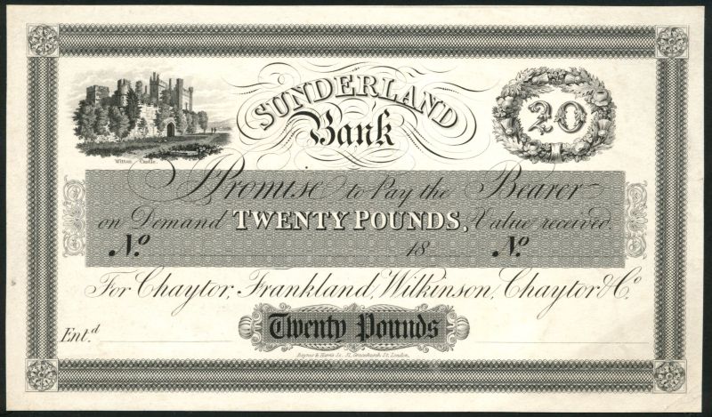 Sunderland Bank (Chaytor, Franland,Wilkinson,Chaytor & Co.), proof £20 on card, 18-, black and white, Witton Castle top left, value within wreath top right