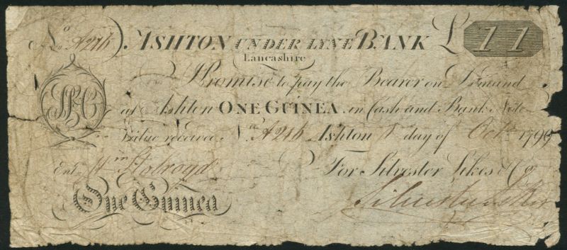 Ashton under Lyne Bank (Silvester Sikes & Co.), , 1 guinea, Ashton, 1 October 1799, serial number A216, black and white, partners initials in wreath top left