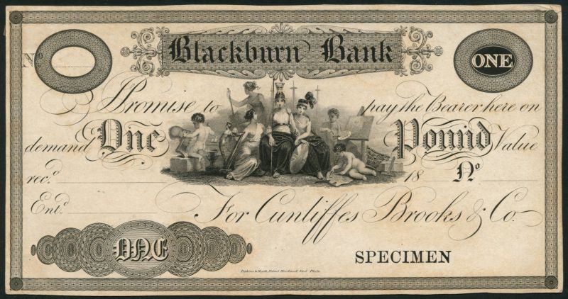Blackburn Bank (Cunliffes Brooks & Co.), proof £1 on card, 18-, black and white, Britannia and allegorical maidens top centre