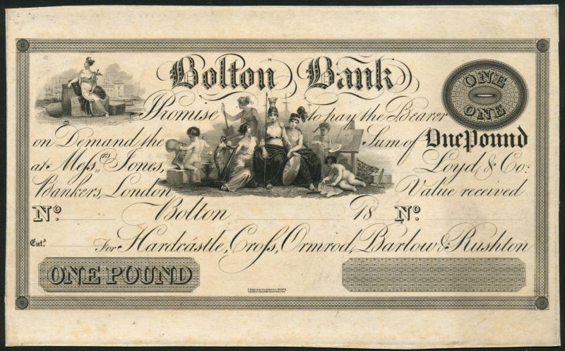 Bolton Bank (Hardcastle,Cross,Ormrod,Barlow & Rushton), proof £1 on card, 18-, black and white, Brittania and allegorical figures top centre, maiden with caduceus top leftolton street scene top centre