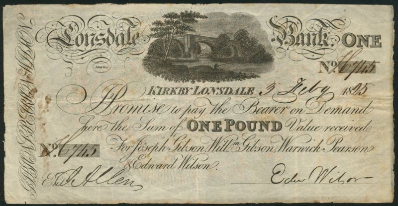 Lonsdale Bank (Joseph Gibson, Willm. Gibson,Warwick Pearson and Edward Wilson), £1, Kirkby Lonsdale, 3 February 1825, serial number H745, black and white, river and bridge top centre, manuscript signature of Edw. Wilson low right, reverse revenue seal