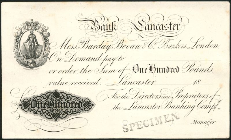 Lancaster Bank, a proof demand note on card for £100, 18-, black and white, crowned vignette of an armoured knight at top left, value in ornate panel low left