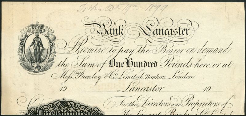 Lancaster Bank, a proof demand note on paper for £20 (4), £50 (4) and £100 (3), all 18- (ca 1899), black and white, crowned vignette of an armoured knight at top left, value in ornate panel low left