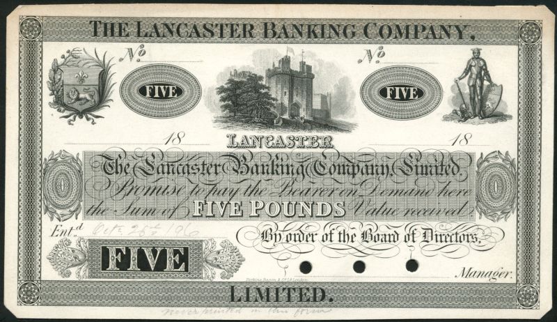 Lancaster Banking Company, proof £5 on card, 18-, black and white, Lancaster Castle top centre, arms top left, armoured knight top right