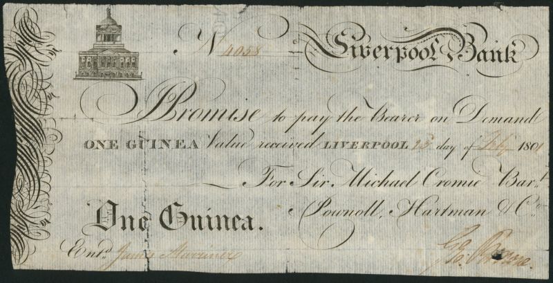 Liverpool Bank (Sir Michael Cromie, Pownoll, Hartman & Co.), 1 guinea (2), 1801, black and white, Liverpool town hall top left, manuscript signature low right