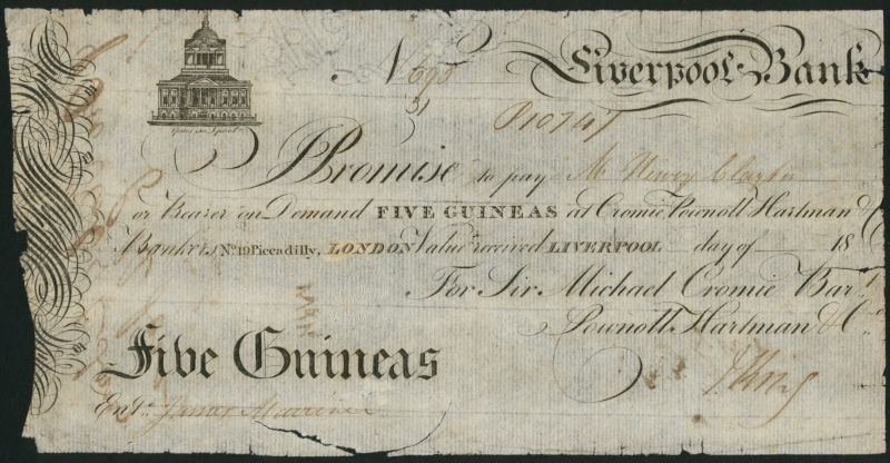 Liverpool Bank (Sir Michael Cromie, Pownoll, Hartman & Co.), 5guineas, 18-, serial number 690, black and white, Liverpool town hall top left, manuscript signature low right