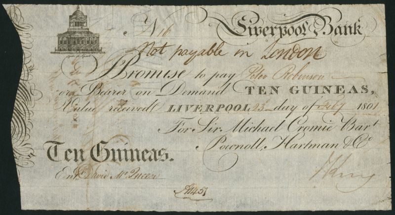 Liverpool Bank (Sir Michael Cromie, Pownoll, Hartman & Co.), 10 guineas 23 February 1801, serial number 16, black and white, Liverpool town hall top left, manuscript signature low right