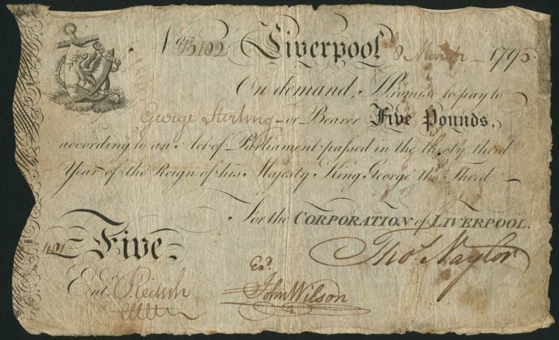 Liverpool Corporation, £5, 8 March 1795, serial number B102, black and white, arms top left, manuscript signature low right, together with another £5 dated 9 July 1793. serial number 0846