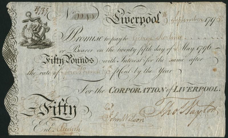 Liverpool Corporation, £50, 16 July 1794, serial number 0849, black and white, arms top left, manuscript signature low right