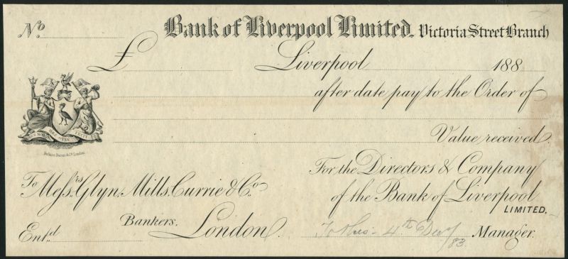 Bank of Liverpool, a selection of proof cheques/sight bills (22), 1880's, black and white, arms at left