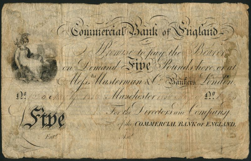 Commercial Bank of England, £5, 3 May 1833, black and white, Britannia at left