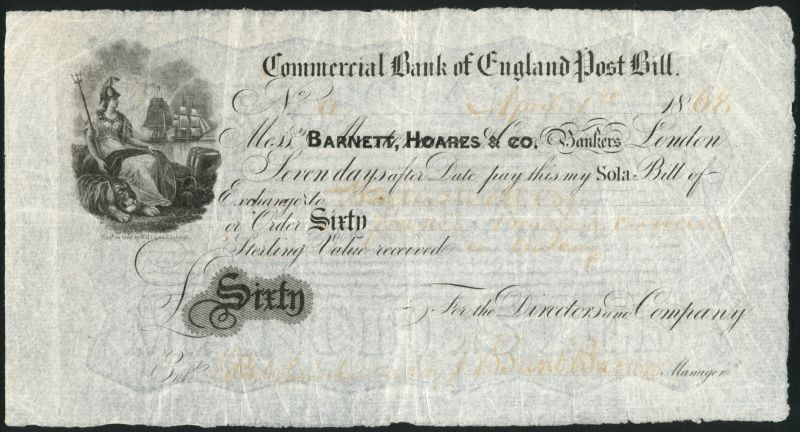 Commercial Bank of England, post bill for £60, 1 April 1868, black and white, Britannia at left