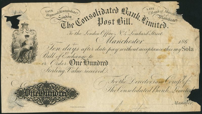 Consolidated Bank limited, proof sight bills or post bills (9) for £20,30,40,50,90(2),100(2),200, 18- (ca 1860's), black and white, crowned vignette of a maiden with caduceus at left