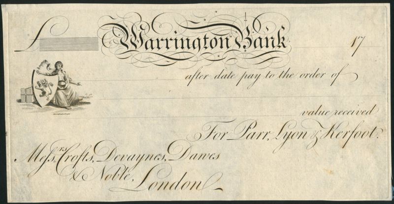 Warrington Bank (Parr, Lyon & Kerfoot), proof sight bill, 17-, black and white, maiden and arms at left