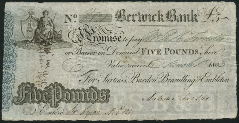 Berwick Bank (Surtees, Burdon, Brandling & Embleton), £5, 1 March 1803, serial number E 821, black and white, maiden and arms top left, manuscript signature of Surtees low right, blue margin at left