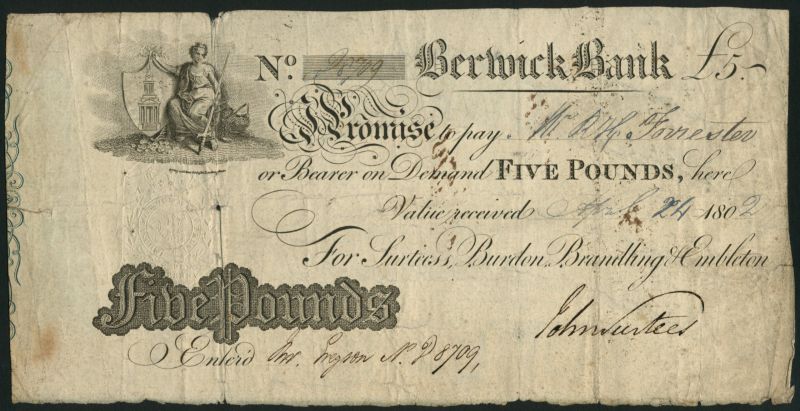 Berwick Bank (Surtees, Burdon, Brandling & Embleton), £5, 24 April 1802, serial number 8709, black and white, maiden and arms at top left, manuscript signature of Surtees low right, blue margin at left