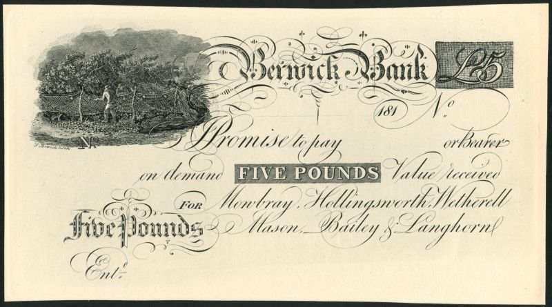 Berwick Bank (Mowbray, Hollingsworth,Wetherell,Mason,Bailey & Langhorne), later pulls of a £1 and £5 and two partial designs, black and white, fisherman and net at left