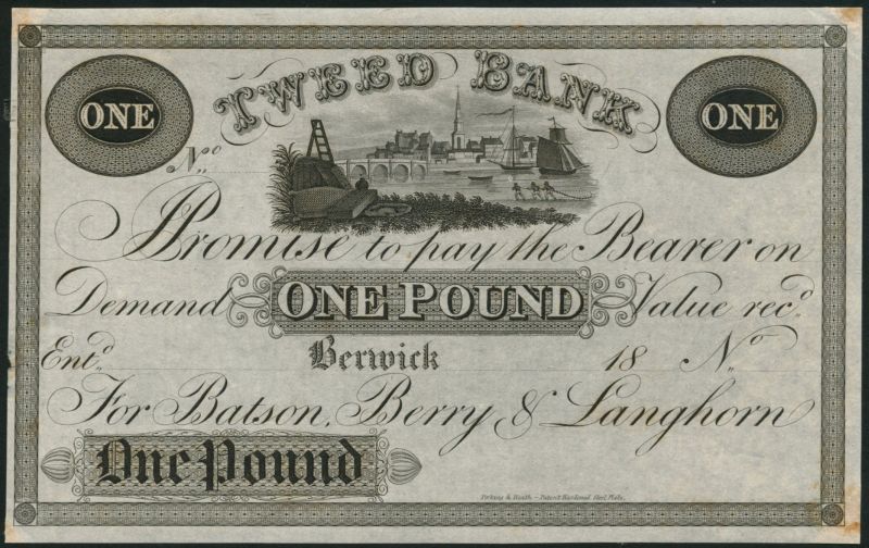Tweed Bank (Batson,Berry & Langhorn), proof £1, 18- (1823-1839), black and white, view of Berwick top centre