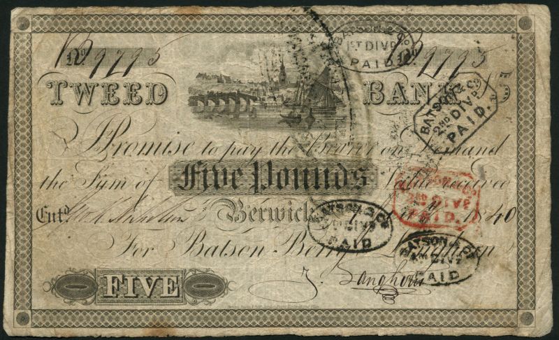 Tweed Bank (Batson,Berry & Langhorn), £5 (2), 1831,1840, black and white, view of Berwick top centre, manuscript signatures of Wilson and Langhorn respectively, also a receipt dated 4 September 1841