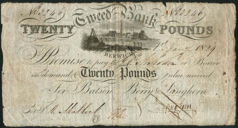 Tweed Bank (Batson,Berry & Langhorn), £20, 1 January 1829, serial number B 3246, black and white, view of Berwick top centre, manuscript signature of Langhorn low right