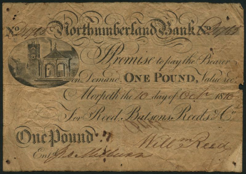 Northumberland Bank (Reed, Batsons,Reed & Co.), £1, 10 October 1810, serial number D 1765, black and white, buildings top left in oval frame, manuscript signature of Reed low right