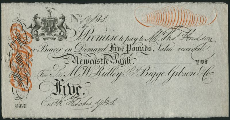 Newcastle Bank (Ridley,Bigge,Gibson & Co.), , part issued £5, ND (ca 1830), black and white, arms top left, ornate red scroll work top right and at left